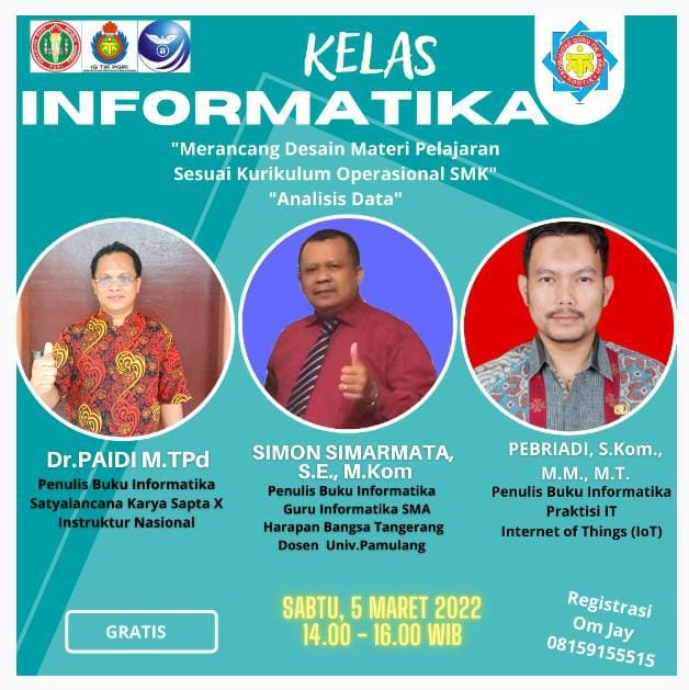 Dengan ini kami mengundang Bapak/Ibu turut hadir di kelas Informatika yang bermanfaat untuk menambah wawasan mengenai materi Merancang Desain Materi Pelajaran Sesuai Kurikulum Operasional SMK, Analisis Data, dan Internet of Things (IoT) bersama ahlinya. Insya Allah akan diadakan pada :