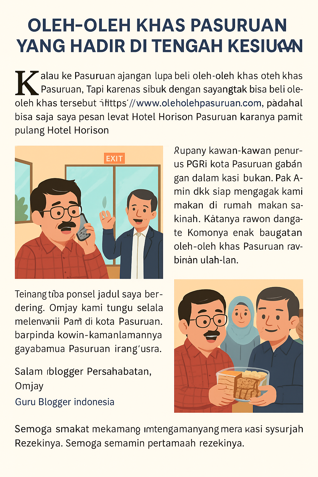 Kalau Anda suatu hari berkesempatan menginjakkan kaki di Kota Pasuruan, satu hal yang jangan sampai dilewatkan: mencicipi dan membawa pulang oleh-oleh khas daerah ini. Tapi siapa sangka, kunjungan saya kali ini ke Pasuruan justru membuat saya tidak sempat membeli oleh-oleh. Kesibukan pekerjaan menuntut waktu dan tenaga saya nyaris tanpa jeda. Laporan harus diselesaikan, kegiatan harus diikuti, dan waktu seakan berlomba dengan agenda yang terus berderet.