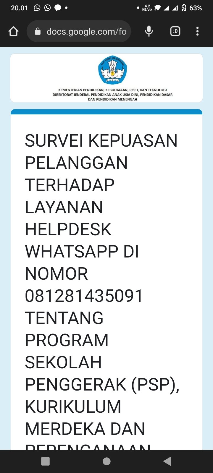 Dengan hormat, kami sampaikan bahwa saat ini Direktorat Jenderal Pendidikan Anak Usia Dini, Pendidikan Dasar dan Pendidikan Menengah, bersama dengan Badan Standar, Kurikulum, dan Asesmen Pendidikan, Kementerian Pendidikan, Kebudayaan, Riset, dan Teknologi sedang melaksanakan survei terkait buku dan layanan helpdesk Program Sekolah Penggerak. Survei ini ditujukan untuk melihat efektivitas peran helpdesk dan juga kebermanfaatan buku Kurikulum Merdeka bagi satuan pendidikan.