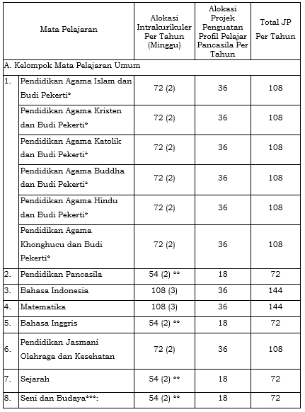 ** Pembelajaran reguler kelas XI tidak penuh 36 (tiga puluh enam) minggu untuk memenuhi alokasi projek 27 (dua puluh tujuh) minggu untuk Pendidikan Pancasila, Bahasa Inggris, Seni, dan Sejarah.