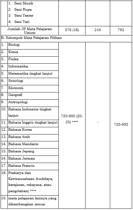**** Alokasi masing-masing mata pelajaran pilihan (selain mata pelajaran Prakarya dan Kewirausahaan) yaitu 5 (lima) JP per minggu atau 180 (seratus delapan puluh) JP per tahun.