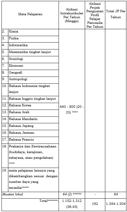 *** Satuan pendidikan menyediakan minimal 1 (satu) jenis seni dan budaya (Seni Musik, Seni Rupa, Seni Teater, dan/atau Seni Tari). Peserta didik memilih 1 (satu) jenis seni dan budaya (Seni Musik, Seni Rupa, Seni Teater, atau Seni Tari). **** Alokasi masing-masing mata pelajaran pilihan (selain mata pelajaran Prakarya dan Kewirausahaan) yaitu 5 (lima) JP per minggu atau 180 (seratus delapan puluh) JP per tahun.